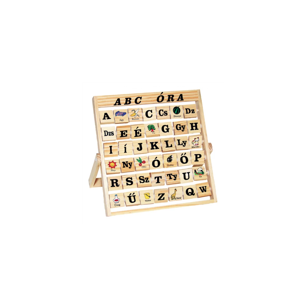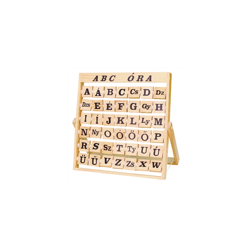 30 cm x 30 cm nagyságú fa állványon helyezkednek el az ábécé betűi forgatható táblácskákon. A lapok egyik oldalán a betű nyomtatott képe látható, a másik oldalon az adott hanggal kezdődő színes kép és az elnevezése van.
