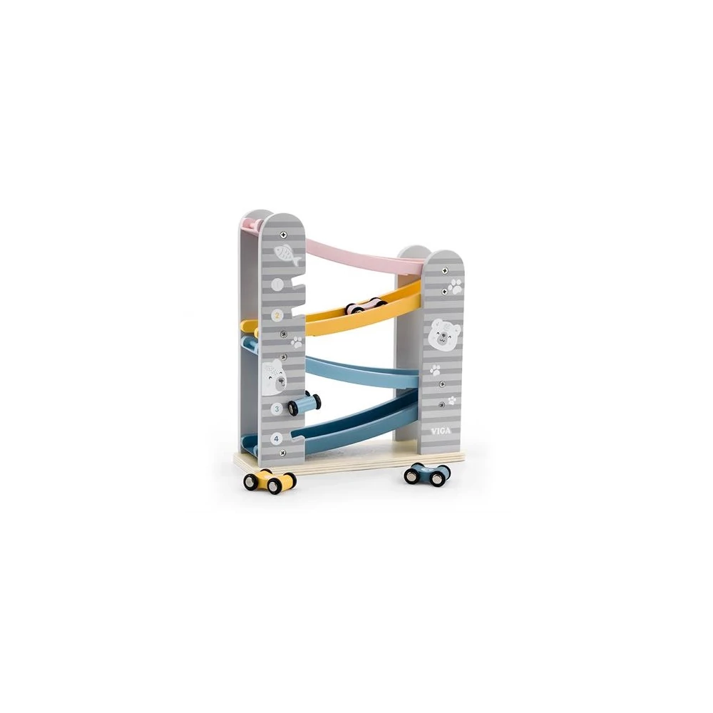 Mintás esztétikus kivitelezésű autópálya torony, ahol a kisautók sebesen haladnak lefelé a lejtőkön. A játék tartozéka a 4 db színes kiasutó.