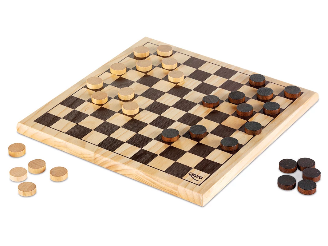Cayro Dáma társasjáték fából 10 x 10 -es játékmezőket tartalmazó táblával és 40 darab fa koronggal.