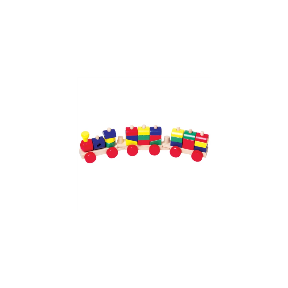 Különböző formájú sok-sok színes nagy méretű fa építőelem. Az elemek lyukasak, így építhetőek rá a vonatra rakományként. A készletből való építkezés összetett gondolkodást igényel, építés közben fejlődik a kreativitás, térlátás, kombinációs készség és a kézügyesség. Ez a fa építőkészlet 23 db építő elemet tartalmaz és 3 egymáshoz csatlakoztatható vonatot.