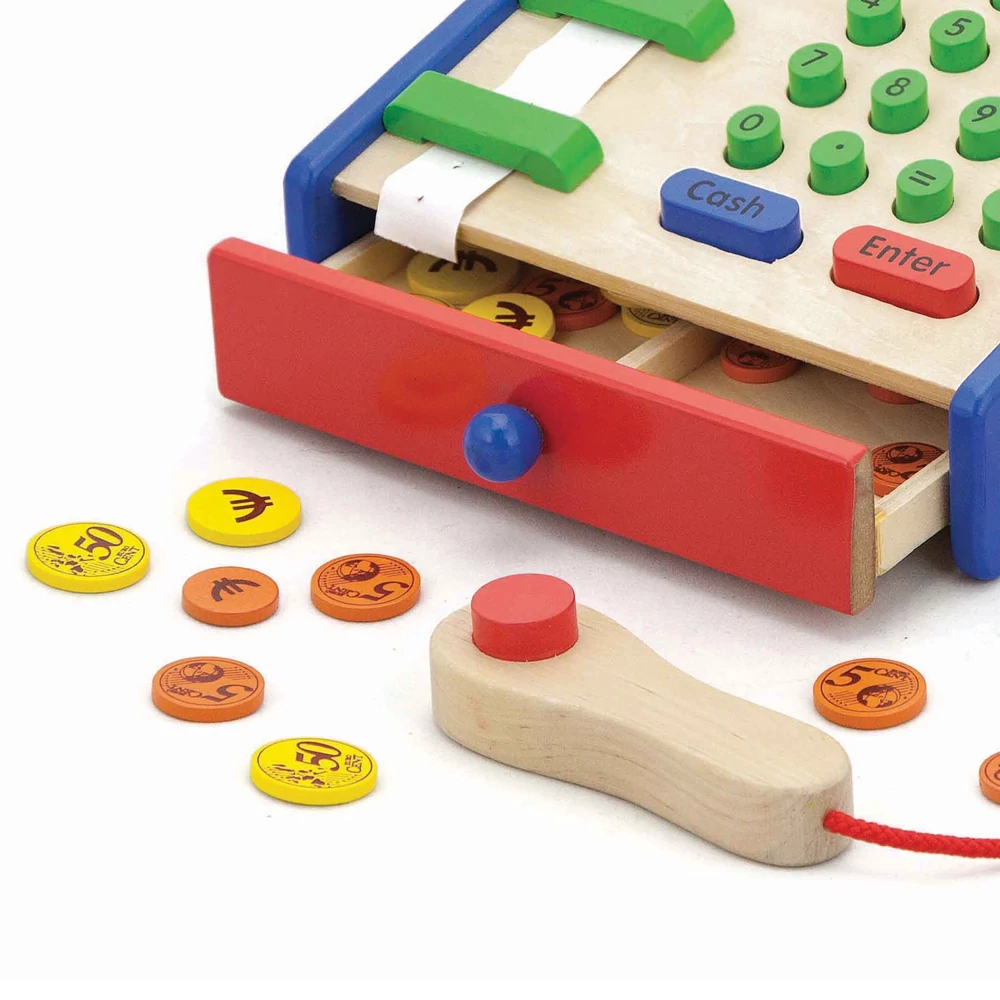 Sokkal izgalmasabb a boltos játék ezzel a színes fa pénztárgéppel, melynek gombjai lenyomhatóak. Kártyás fizetés lesz, vagy készpénzes? Itt a vásárlási bizonylat. A játékhoz papírtekercs tartozik, melyet könnyű a helyére fűzni. Hatalmas a kasszafiók, átláthatóan rendezhető benne a váltópénz. A fajáték könnyen tisztán tartható.