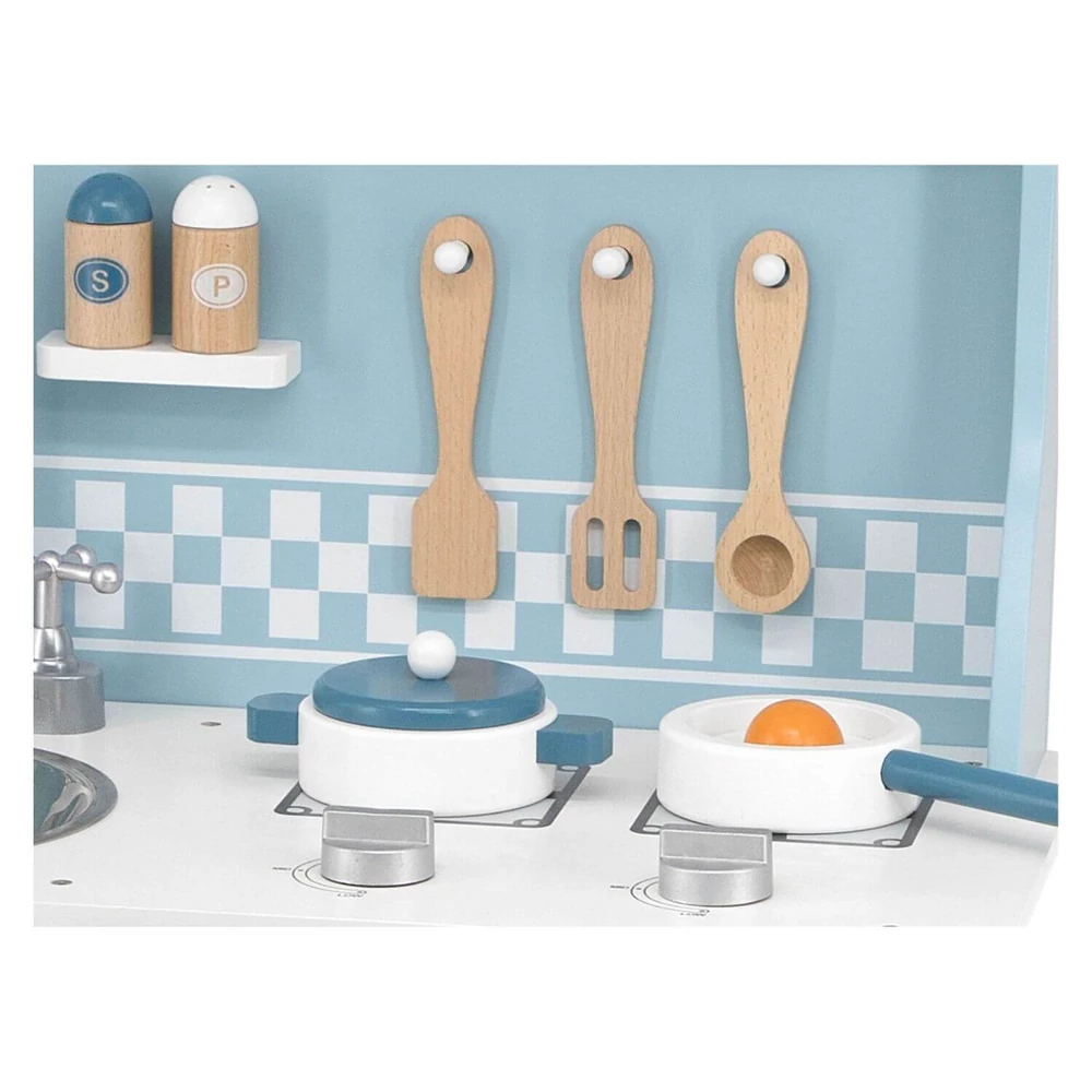 Ez a fából készült pasztell kék játékkonyha a gyerekek kedvelt játéka lehet. Egyik felében a sütő van, melynek ajtaja nyitható. Felette a tűzhely, rajta 2 edénnyel. Mi készül éppen? Tükörtojás! A fa játékkonyha másik oldalán lent az edények tárolhatók, fölül pedig a mosogató kapott helyet.