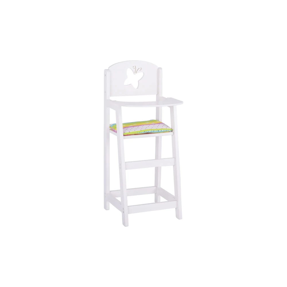Fehér játékbaba etetőszék rózsaszín párna. A szék háttámláján pillangó alakú kivágás van. Stílusos kis bútor a játék babáknak. Az etetőszéket lapraszerelten, biztonságos módon szállítjuk. Összeszerelési útmutató a dobozban található. A játék egészségre ártalmas anyagot nem tartalmaz.