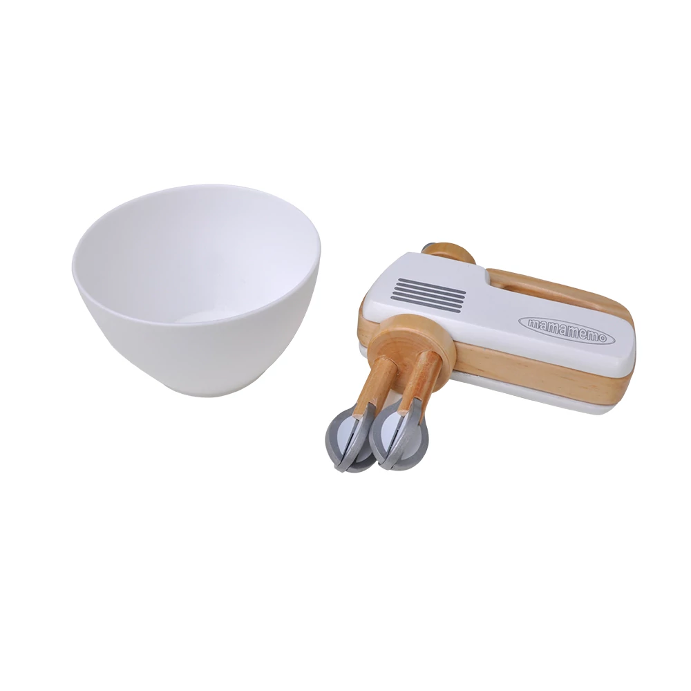 Valósághű és különleges kiegészítője a babakonyháknak és játszó szobáknak ez a fehér fa kézi mixer és a hozzá tartozó keverő tál.