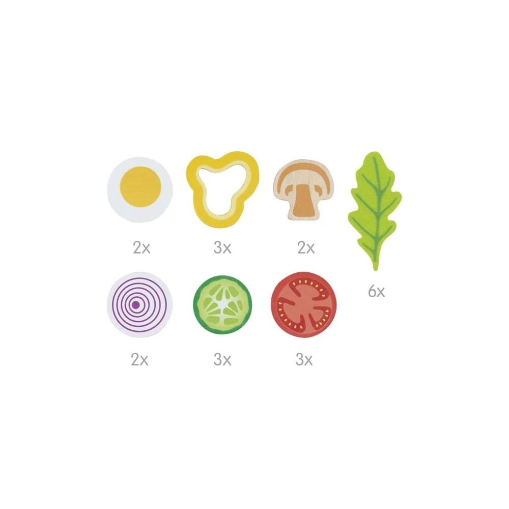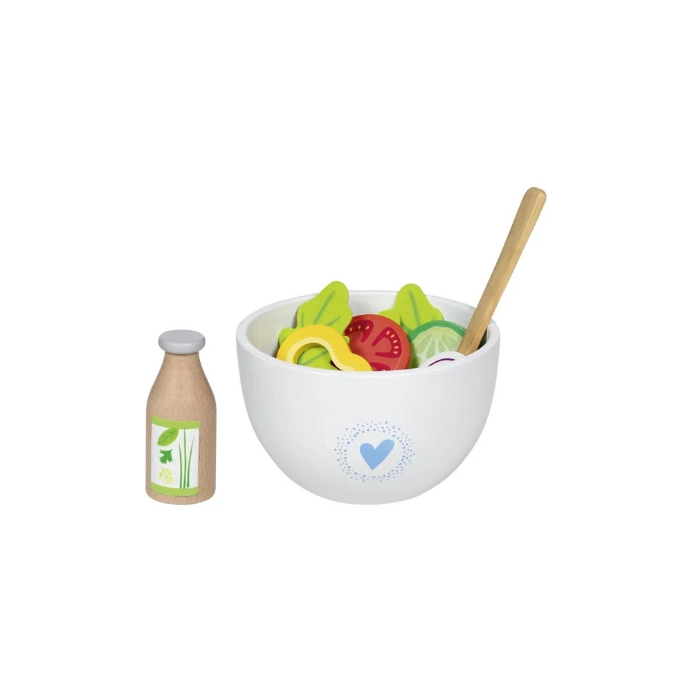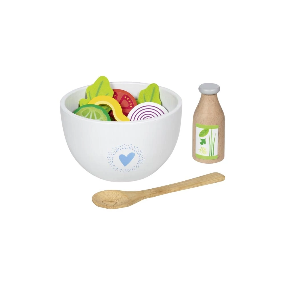 Goki 51446 színes salátakészító szett, fa zöldségekkel, salátástállal, kiszedővel és öntettel játék konyhába.