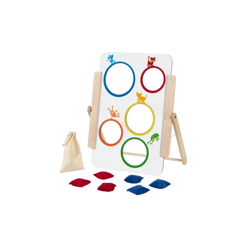 Ezzel a frappáns célbadobó játékkal kisebb és nagyobb gyerekek is játszhatnak, ugyanis a tábla egyik oldalán a lyukak színes karikái mellett kedves állatfigurák láthatók, míg a másikon számok. A legkisebbek is próbára tehetik ügyességüket egy vidám célbadobó játékkal. A megfordított táblán pedig nehezítésként a karikákhoz pontszámok tartoznak, kezdődhet a célbadobó verseny. A célbadobó állvány laposra csukható.