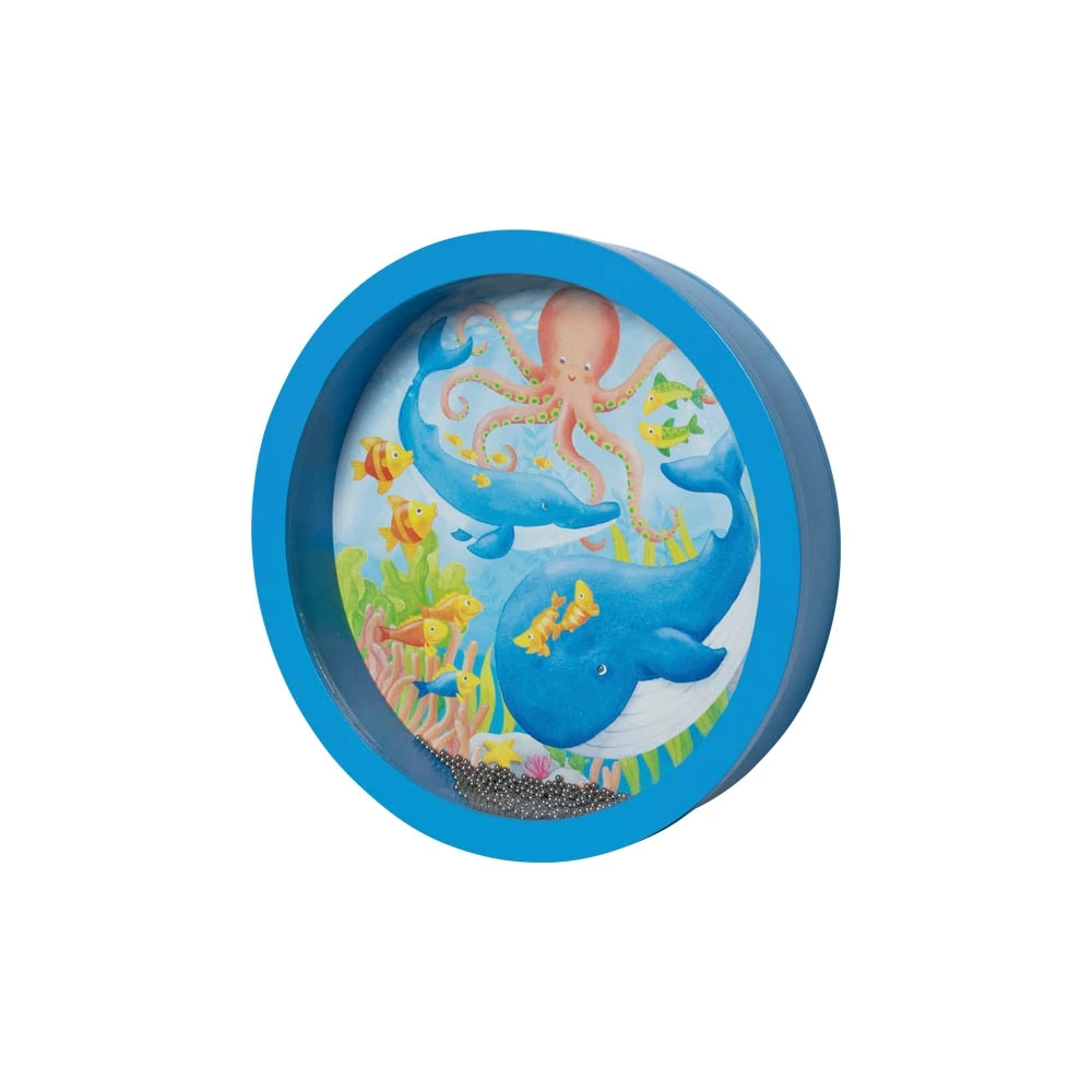 Goki 61853 kék színű, óceános mintás dob, golyókkal a belsejében. Eső hangját, óceán zúgását utánzó dob, hangutánzó ritmushangszer.