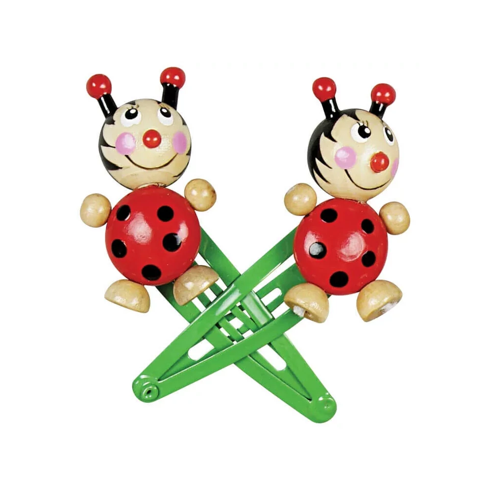 Nagy piros-fekete katica figurás citromsárga hajcsat pár. A fa figura apró csavarral biztonságosan rögzített a csatthoz.