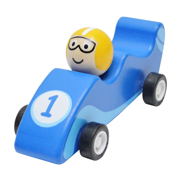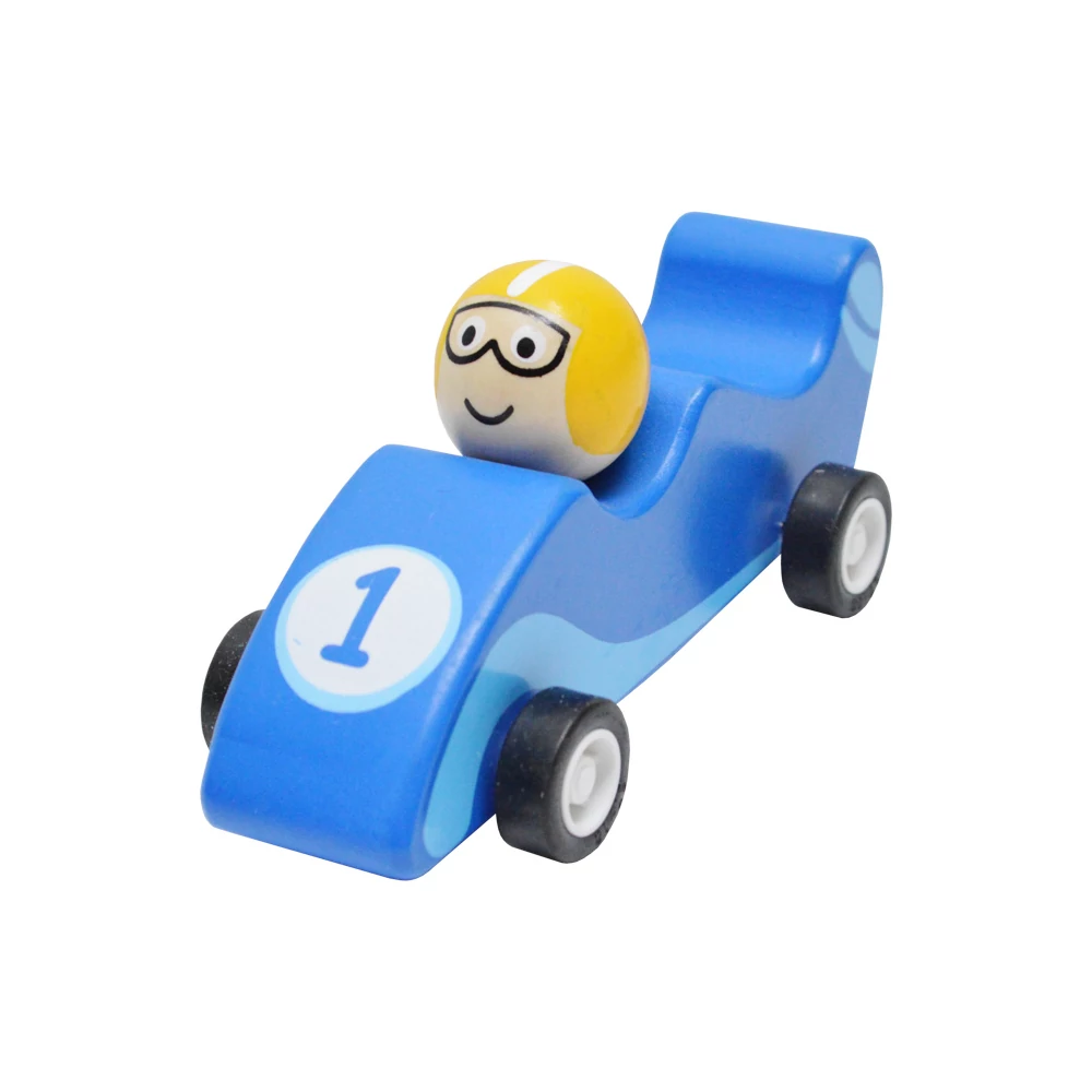 A kis kék versenyautót kattanásig hátrahúzzuk a talajon, majd elengedve sebesen tovagurul.