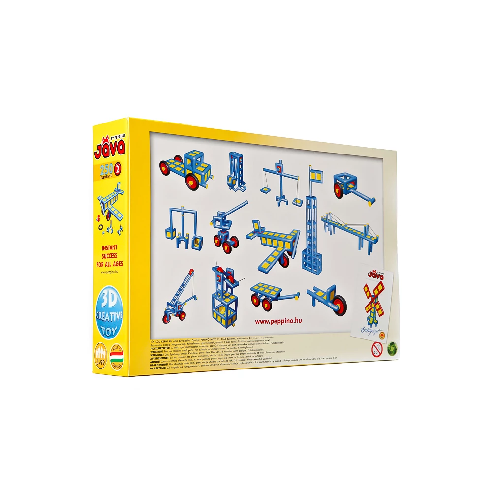 Jáva 2 a klasszikus építőjáték, fejleszti a kézügyességet, kreativitást és a térlátást. Ez a készlet 246 db elemet tartalmaz, a dobozban minden tartozék és elem megtalálható, ami képen látható tárgyak megépítéséhez szükséges: helikopter, daru, teherautó, felvonó, híd és malom, a dobozban ötletfüzet található további megvalósításra váró izgalmas építményekkel.