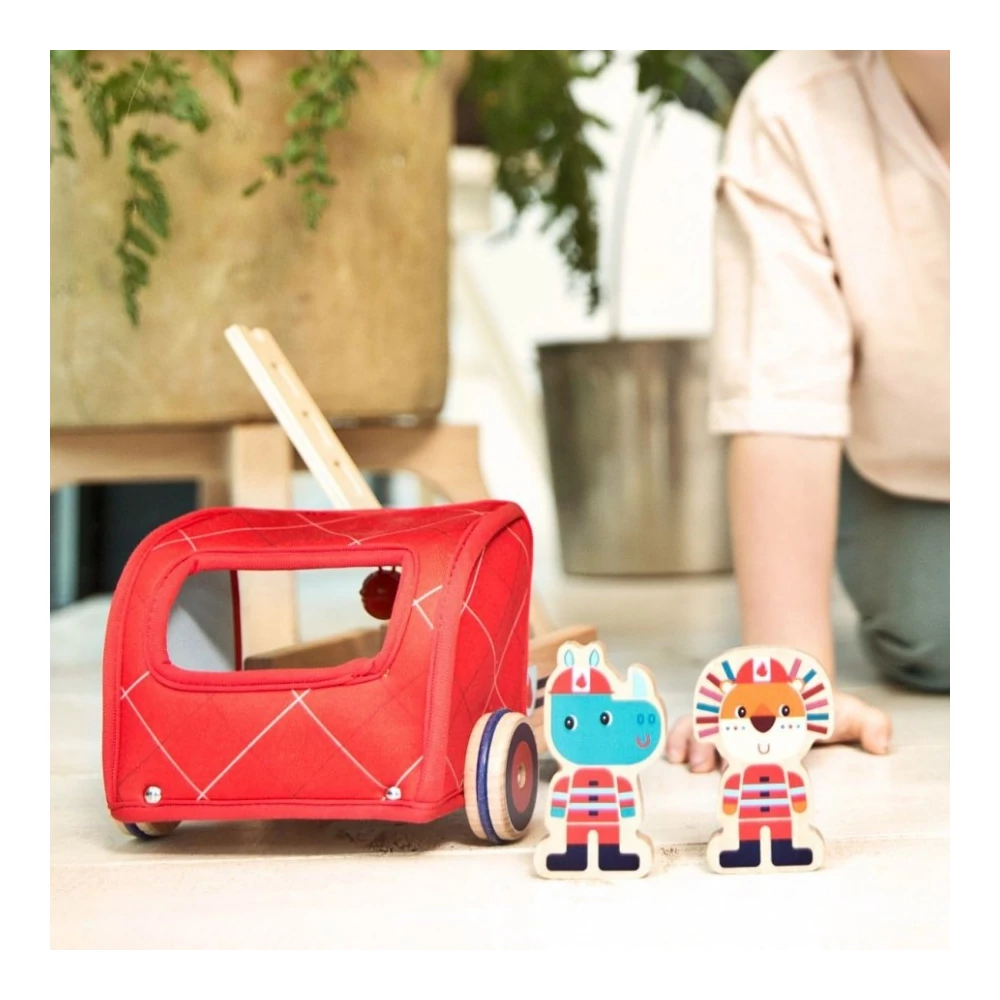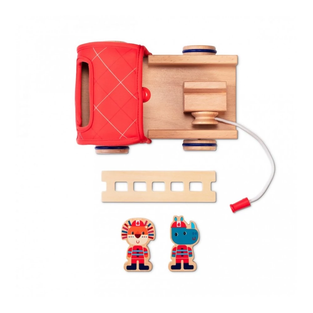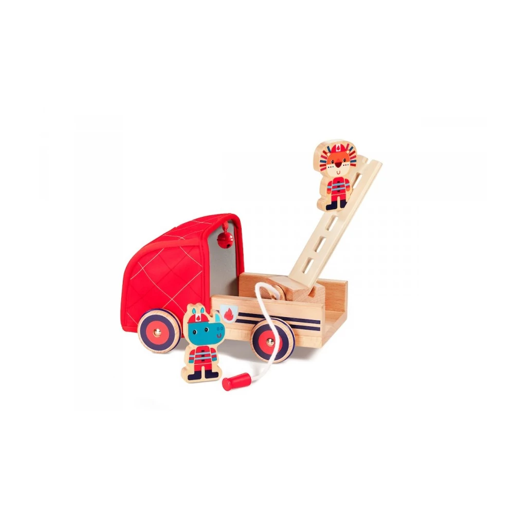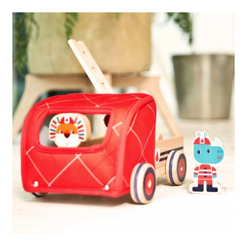 Gyönyörű tűzpiros játék tűzoltóautó, melynek fülkéjében ül Jack, az oroszlán és Marius, az orrszarvú. A két jó barát tüzet olt, ha szükséges a letekerhető vizes tömlővel és a mozgó, forgatható létra segítségével. Amikor kész a mentés, minden kellék elfér a nagy tűzoltóautóban. A fa tűzoltóautónak piros kerekein gumigyűrű van, nagyon könnyen és halkan tud gurulni a jármű. Piros kis fém csengettyű jelez, hogy merre jár a tűzoltóautó. Hosszú és izgalmas szerepjátékokhoz tökéletes választás ez a különleges textillel borított fa tűzoltóautó.