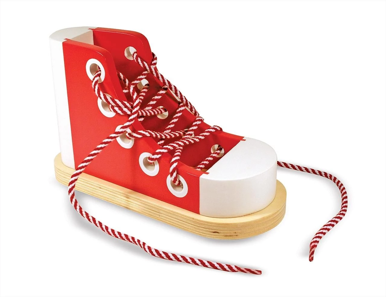 Melissa and Doug 3018 piros facipő színes cipőfűzővel cipőfüzést tanító fa készségfejlesztő játék.