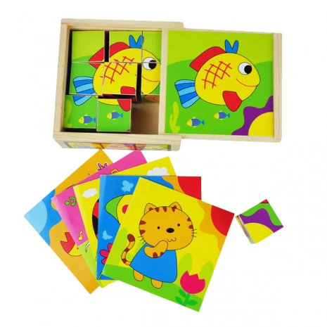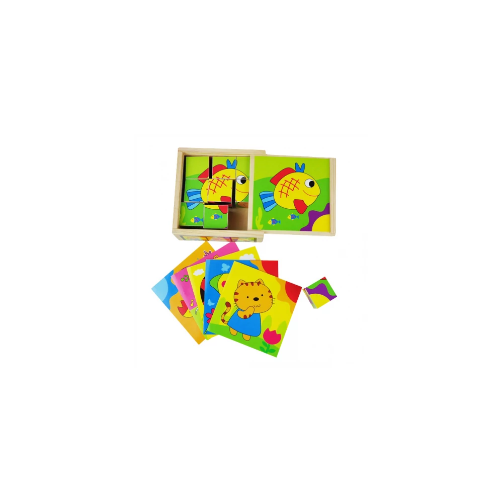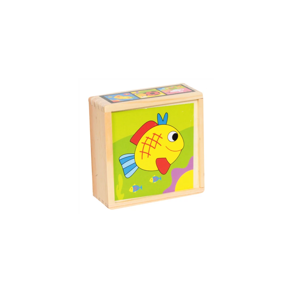 9 nyomtatott fakockából 6 képet lehet kirakosgatni kedves állatfigurákról: halacska, katica, maci, cica, egér, rák és pillangó. Minden képről séma van a játékhoz és egy zárható fadoboz. A képek kirakása komoly összpontosítást igényel, kitartást és logikus gondolkodást. A mesekocka kirakót 4 éves kortól ajánljuk.