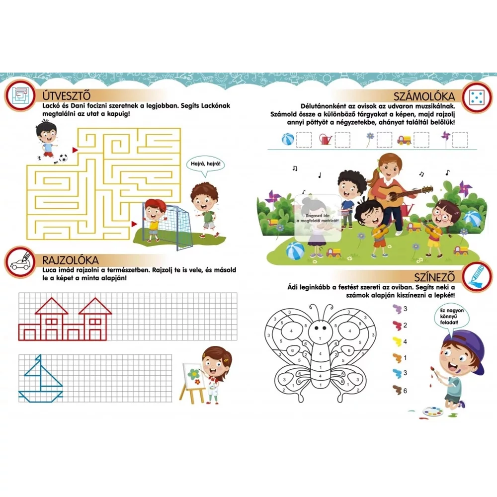 A változatos feladványokat sok-sok matrica teszi még izgalmasabbá.