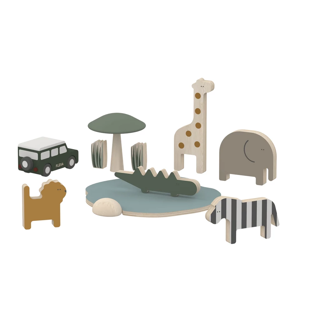 FLEXA fa asztali kirakó szafari állatokkal, melyek egy tó partján pihennek, bárki meglátogathatja őket a dzsippel.