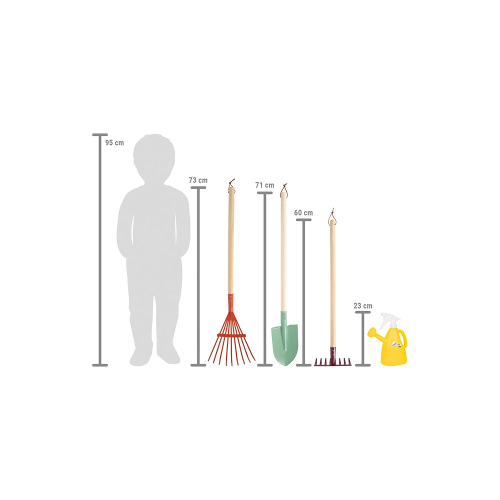 Small foot 12663 színes fém kerti szerszámok gyerekeknek felakasztható fa nyéllel kertészkedéshez és egy bájos öntöző és vízpermetező kanna.