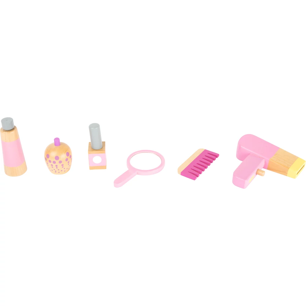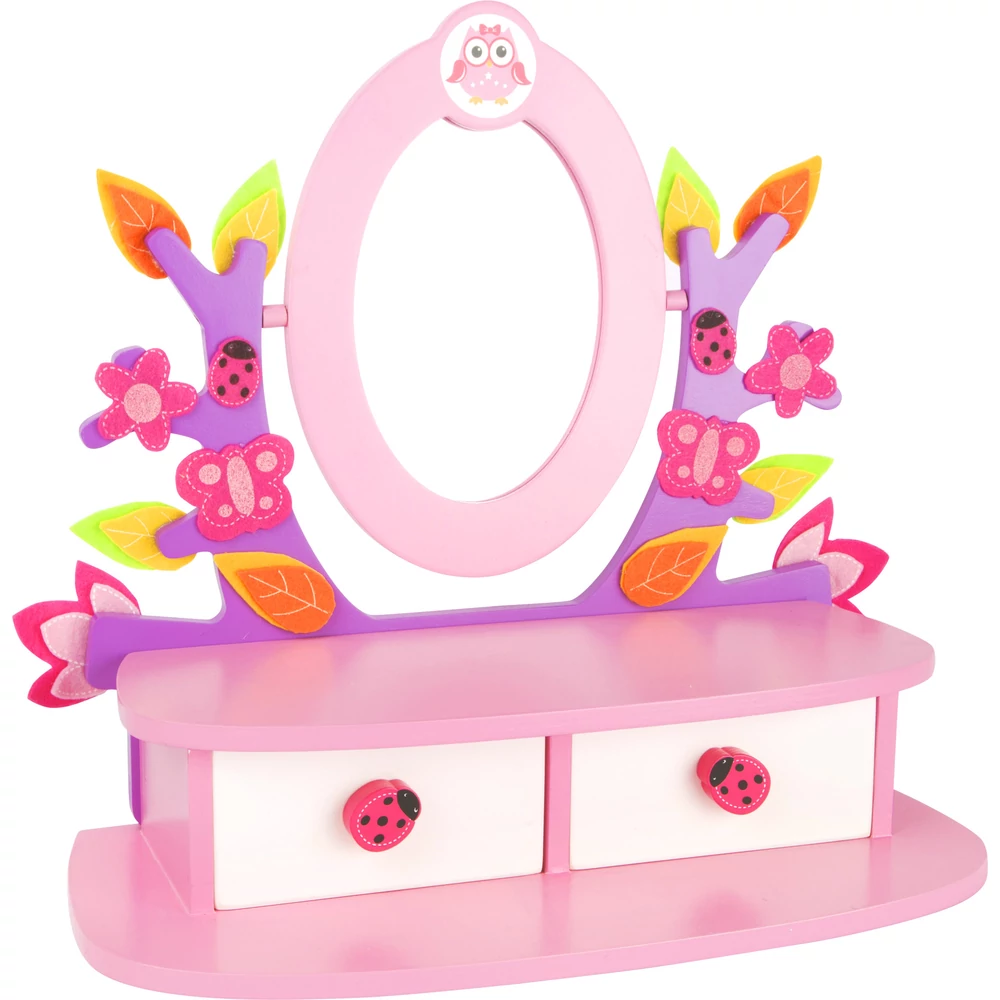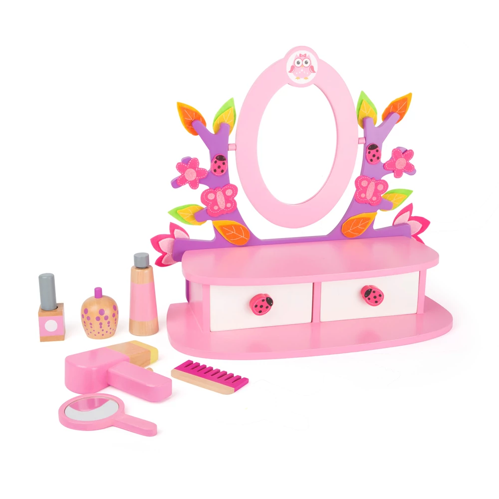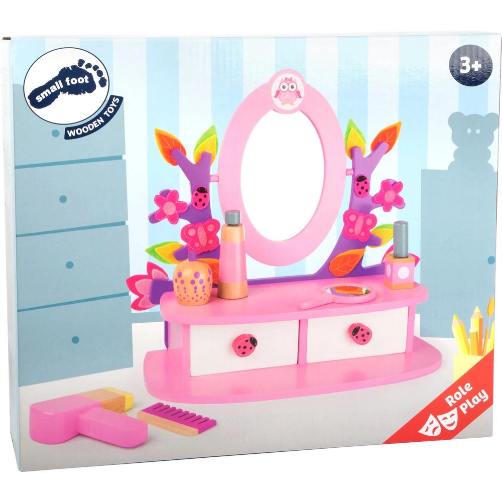 A szépítkezés elmaradhatatlan kelléke ez a játék sminkasztal valódi tükörrel. Minden kislánynak tetszeni fog ez a rózsaszín játékbútor. Reggel, amikor felébredtek a babák, ülhetnek is le fésülködni, sminkelni, szépítkezni. A rózsaszín sminkasztalon minden kellék megtalálható, ami ehhez kell: fésű, parfümös üveg, körömlakk, kézitükör. A palackos sampon kupakja levehető. A hajszárító gombja ki-be kapcsolható. Az összes kellék biztonságosan tárolható az asztal alatti két fiókban. Széppé teszi a kis asztalt a díszítés is: a fa ágain filcből készült lepkék, virágok, katicabogarak vannak. A fiók fogója is katicabogarat ábrázol. A tükör felett pedig egy kis bagoly díszeleg.