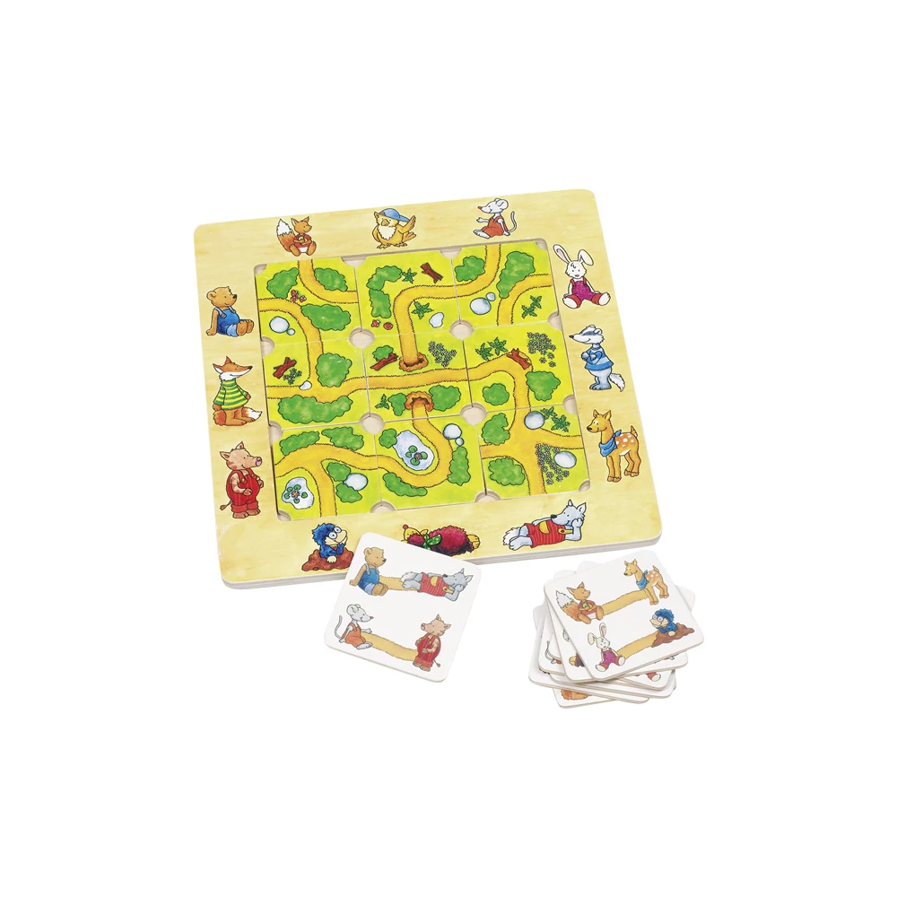 Azt szeretnénk, hogy két állat megtalálja egymáshoz az utat. 20 darab állatpár feladvány kártya szerint kell a kirakóba az úthálózatot ábrázoló 9 darab fa lapot elhelyezni. Az útkereső játék a finommotorikát és a szem-kéz koordinációt fejlesztő ügyességi játék.